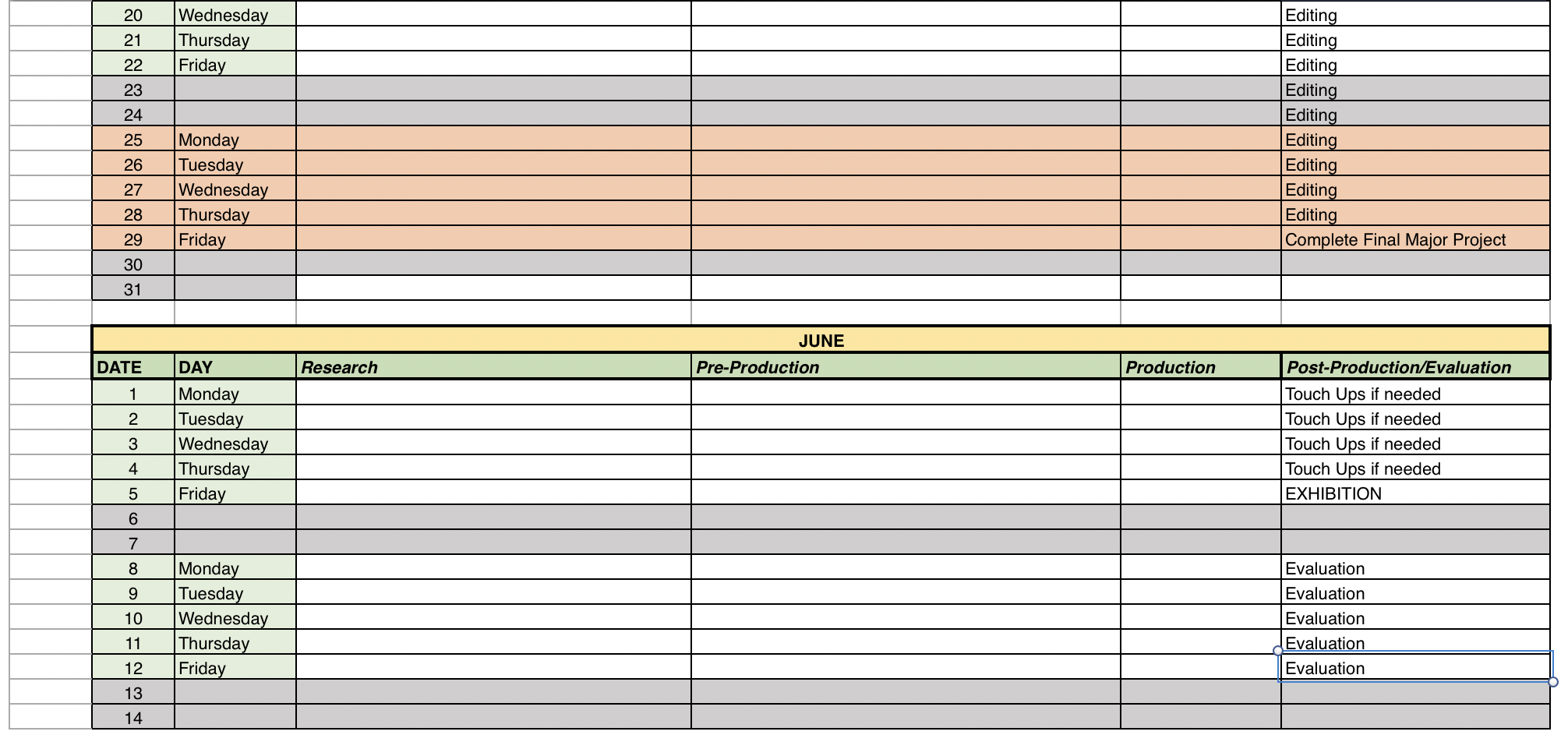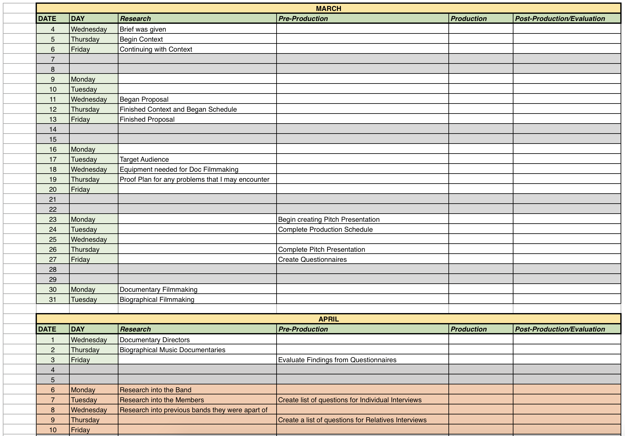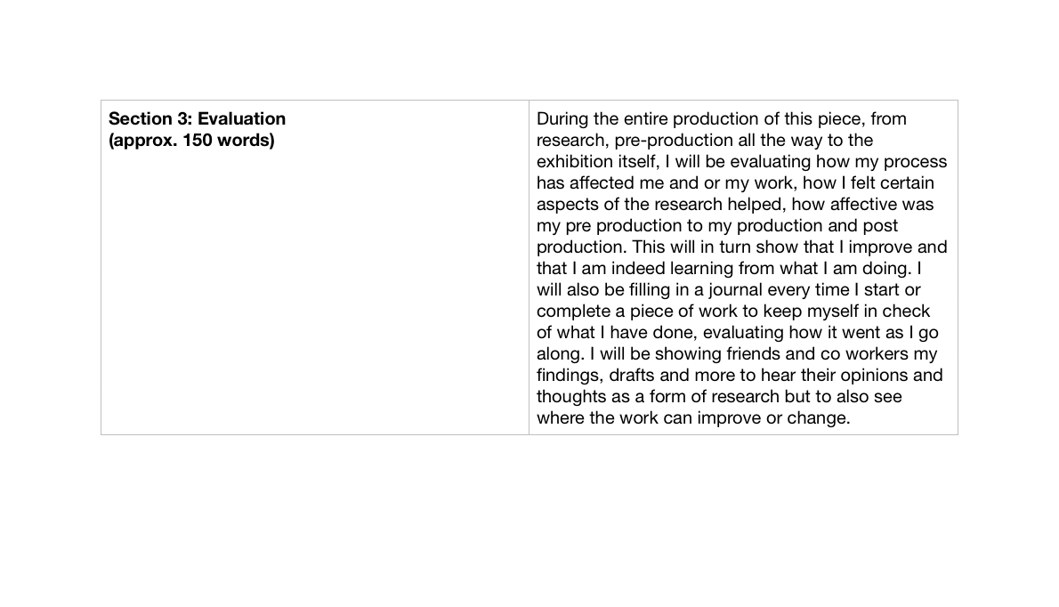 I have had to show my Proposal and Production Schedule in the form of images as WordPress will not allow me to upload the actual file, for security reasons. I will include the Proposal and Production Schedule in a folder contain all of the work I create over time and the final piece itself. I will be following this production schedule as best as I can because I have been known in the past for poor time management, and leaving work to the last minute however, with this I will be able to improve on my time management and prepare myself for University and Industry level work, where creating work just from your head and not placing every detail down on paper first is not an option. I believe that this final major project will be a benefit to me in my preperation for University.