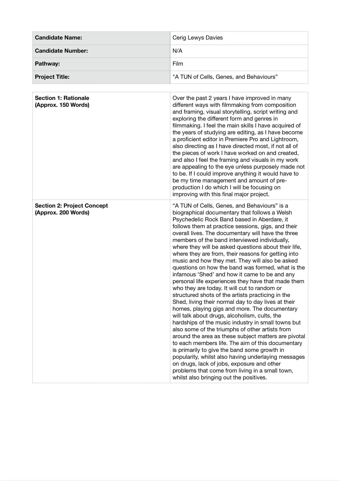This is a documentary which follow a Welsh Band called TUN. They are a Psychedelic Instrumental Rock band originating in Aberdare, South Wales where the band was forged in ‘The Shed’. The documentary will go through their lives and how they came to meet and create TUN, going through any life problems they have dealt with (specifically my uncle), how TUN has helped them since it began, following them on gigs, practices and general sessions. The piece is entirly biographical and factual with only their names being fictional as they go by their ‘character’ names. For example my uncle Gene’s character is ‘Genes’ who carries a bag of genetics on them and takes the genetics from other people and places them in his bag. Even though they will be presenting themselves as their characters, they will not be acting as their characters, although the way they act natural will make you think they are just playing characters. Even though this is for a final major project, this is also a passion project and I hope it turns out well if I do make it.