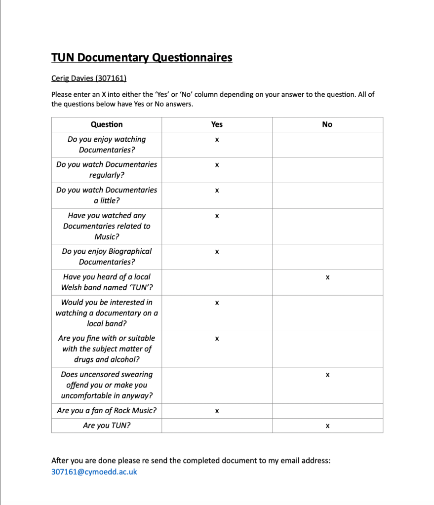 After looking through the questionnaire I created for this project, I found that all the people who filled in the questionnaire didn’t have any problems with uncensored swearing, talking about drugs etc and are comfortable with seeing it in the documentary. They all like rock music, and are all fans of documentaries with a majority of them watching documentaries regulary. The question “are you TUN?” I was not expecting people to answer with yes as people do not understand what it is to be TUN, so hopefully after they watch the documentary, I will ask them again and see what their answer is then.