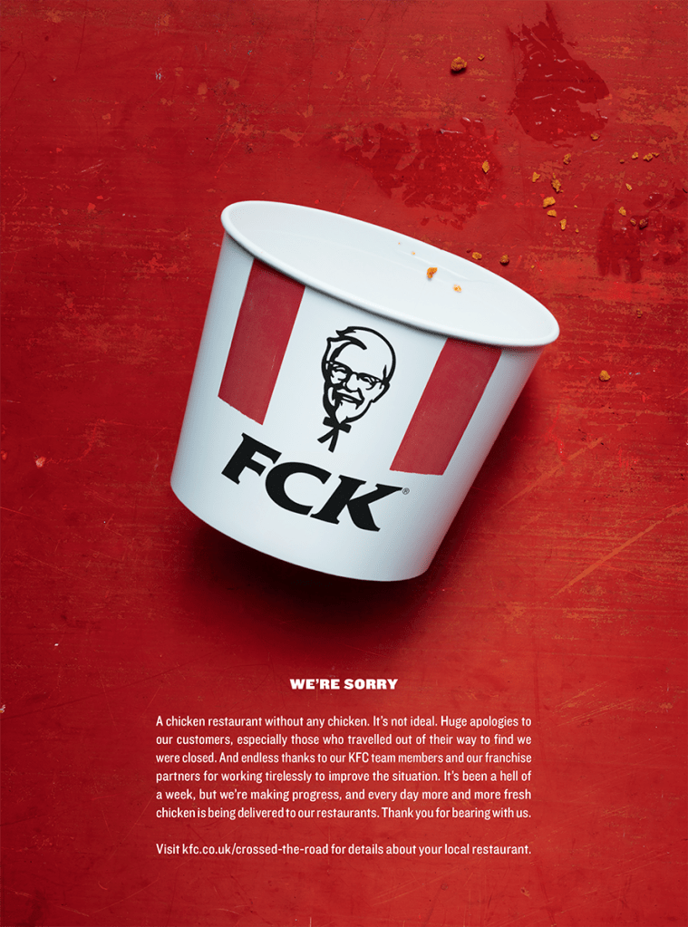 This ad was created by KFC because they had to close their stores around the UK due to them changing their chicken distributer abruptly. So, to say sorry, KFC released this poster which automatically calmed the uproar and gained them more customers. The use of humour in the switching of the letters on the bucket from ‘KFC’ to ‘FCK’ in a play on words to them apologising for the problem they had caused for their customers. Also the use of the bucket causes the audience to subconsciously think of KFC’s food without even having to see any of it.